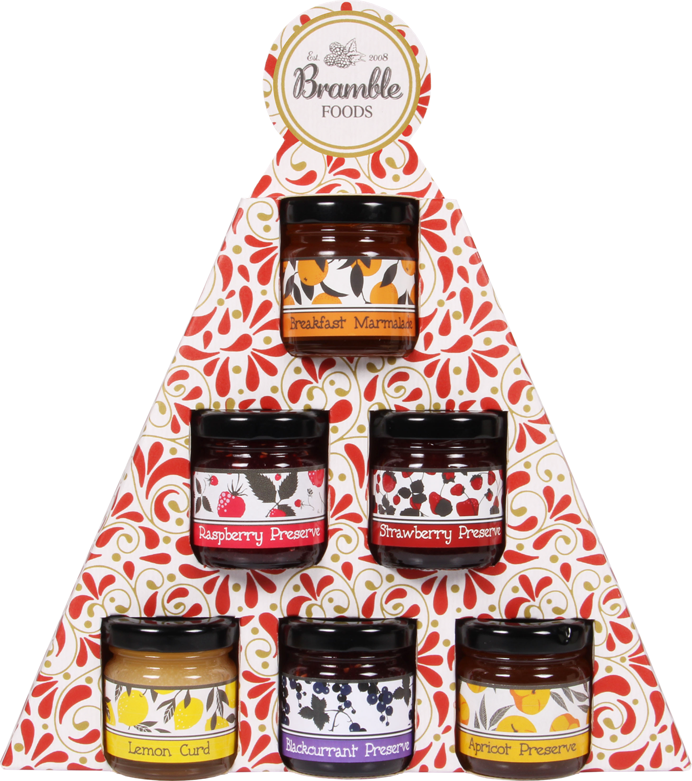 Tree shaped box with 6 x tiny jars:Strawberry Jam,Blackcurrant jam,Real Ale Chutney,Spicy Tomato & Caramelised Onion ChutneyLemon Marmalade with Gin & Lime,Cider Apple Jelly.Ingredients:So Strawberry Jam: Sugar, Strawberries, Lemon Juice (1%), Gelling Agent: Pectin.; Blackcurrant jam: Blackcurrants, Sugar, Gelling Agent: Pectin.; Real Ale Chutney: Vegetables in varying proportions (43%) [Carrot, Onion, Swede, Cauliflower], Sugar, Malt Vinegar [From BARLEY], Apples, Tomato Paste, Dates [Dates, Rice Flour], Cornflour, Real Ale (1%) [Malted BARLEY, Brewers Yeast], Salt, Lemon Comminute, Acidity Regulator: Citric Acid, Ground Spices, Garlic Puree, MUSTARD Powder.; Spicy Tomato & Caramelised Onion Chutney: Tomato (45%) [Tomato, Tomato Juice, Citric Acid], Sugar, Onion (11%), Spirit Vinegar, Tomato Paste (3%), Thickener: Starch, Salt, Spices, Sunflower Oil, Coriander, Garlic Puree, Brown MUSTARD Seeds, Acidity Regulator: Citric Acid.; Lemon Marmalade with Gin & Lime: Sugar, Lemon Pulp, Lime Comminute, Gin (4%), Gelling Agent: Pectin, Juniper Oil.; Cider Apple Jelly: Sugar, Cider (40%) [Sulphur Dioxide], Water, Cider Vinegar, Gelling Agent: Pectin, Lemon Juice Concentrate.Suitable for vegetarians.Allergy advice: For allergens, see ingredients in bold.Prepared in premises where egg, milk, soya, and gluten are also used.