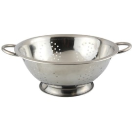 The Chef Aid Sieve can be used as a sieve and colander. With a metal stand unlike other sieves it rests on the surface for draining to help prevent spillages. The Tin material has small perforations allowing you to use as you would a fine mesh sieve but with the strength of a colander. It is easy to clean and has along handle.