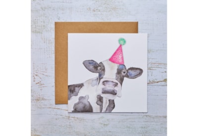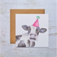 Square white birthday card with illustration of a black and white cow wearing a blue party hat and next to a blue balloon printed with "Happy Birthday." Text at the top reads "HOLY COW, HOW OLD?!". Brown envelope included.