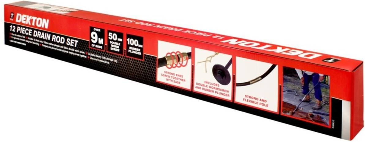 Includes 10 drain rods, 100mm rubber plunger and 50mm double worm screw.Includes heavy duty storage bag.