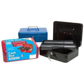 Cash Boxes 15cm/6inch Cash BoxAssorted Colours2 keysMetal handle Removable 6 compartment tray