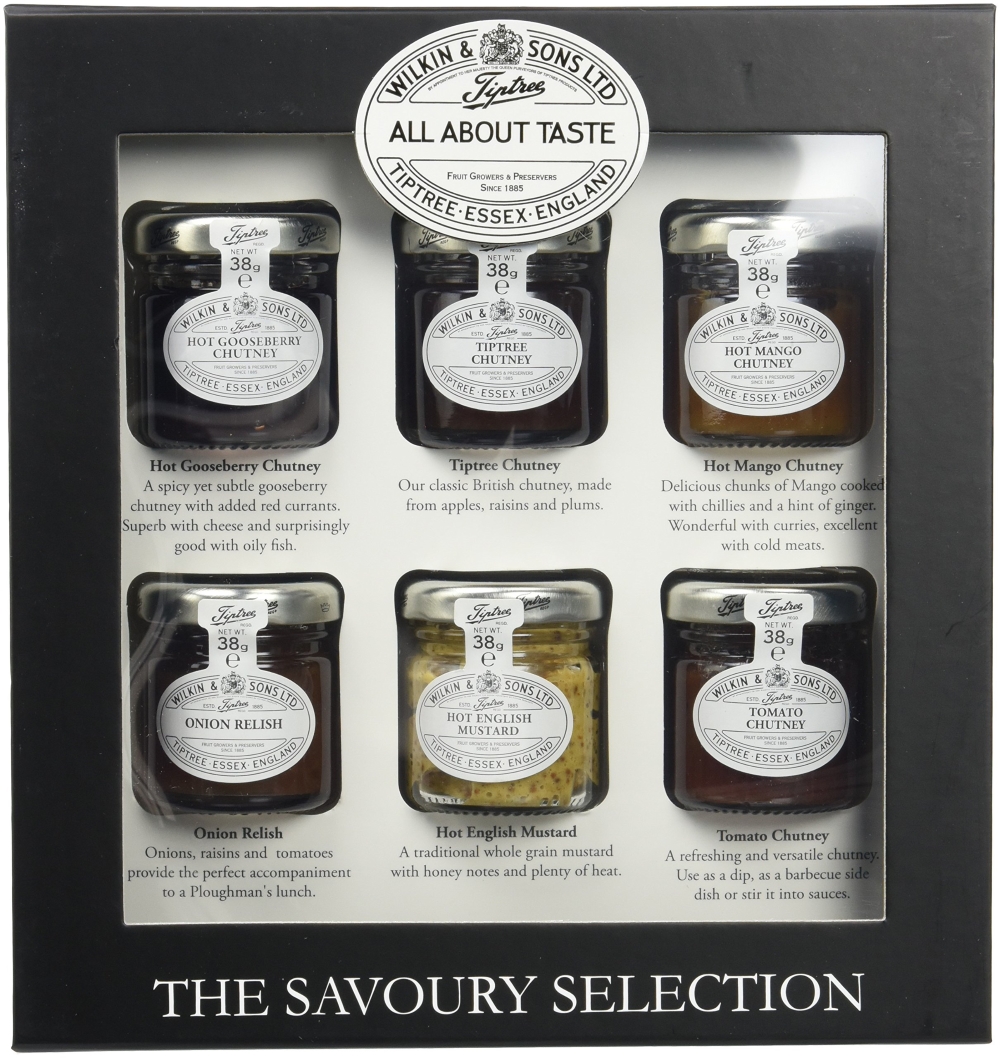 Cracking cranberry sauce, cider & horseradish mustard, seville orange marmalade, beautiful blackcurrant jam, spicy tomato & caramelised onion chutney, lemon marmalade with gin & lime and onion marmalade.Ingredients:CRACKING CRANBERRY SAUCE: Cranberries (74%), Sugar, White Wine Vinegar, Sweet Orange Pulp, Orange Juice, Orange Zest, Spices.; CIDER & HORSERADISH MUSTARD: Cider (19%) [Cider, Sulphur Dioxide], Horseradish Sauce (17%) [Horseradish, Rapeseed Oil, Water, Spirit Vinegar, Sugar, Mustard Flour, Salt, Horseradish Flavour, Stabiliser: Xanthan Gum, Preservative: Potassium Sorbate], Brown Mustard Seeds (15%), Spirit Vinegar, Mustard (13%), Yellow Mustard Seeds (10%), Water, Acidity Regulator: Citric Acid, Salt, Spices.; SEVILLE ORANGE MARMALADE: Sugar, Seville Orange, Lemon Juice (6.5%), Lemon Zest (1.8%), Gelling Agent: Pectin.; BEAUTIFUL BLACKCURRANT JAM: Blackcurrants, Sugar, Gelling Agent: Pectin.; SPICY TOMATO & CARAMELISED ONION CHUTNEY: Tomato (45%) [Tomato, Tomato Juice, Citric Acid], Sugar, Onion (11%), Spirit Vinegar, Tomato Paste (3%), Thickener: Starch, Spices [Mustard Seeds], Salt, Sunflower Oil, Coriander, Garlic, Acidity Regulator: Citric Acid.; LEMON MARMALADE WITH GIN & LIME: Sugar, Lemon, Lime [Lime, Sulphur Dioxide], Gin (4%), Juniper Oil.; ONION MARMALADE: Onion (49%), Sugar, Balsamic Vinegar [Wine Vinegar, Grape Must, Sulphites], Brown Sugar, Extra Virgin Olive Oil, Gelling Agent: Pectin, Demerara Sugar, Acidity Regulator: Citric Acid, Lemon.Allergy advice: For allergens including cereals containing gluten, see ingredients in bold.Prepared in premises where mustard, egg, milk, soya, celery and sulphites are also used.