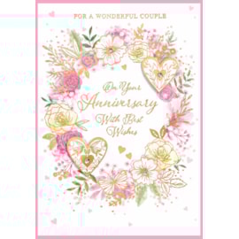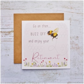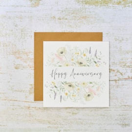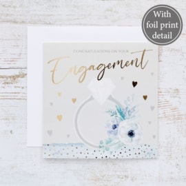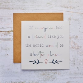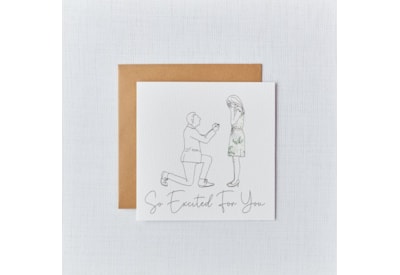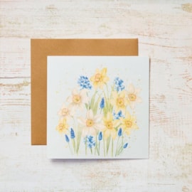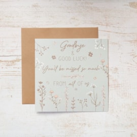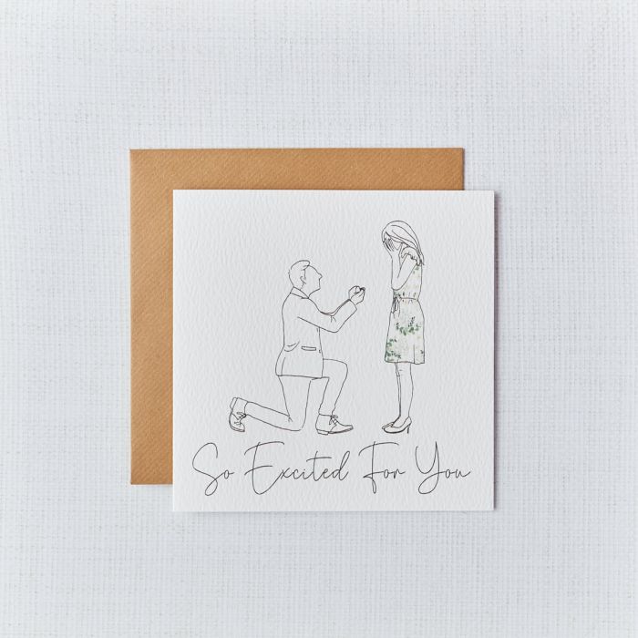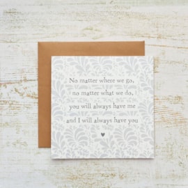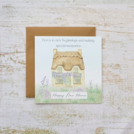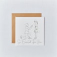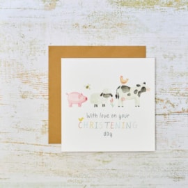 Square paper card with white background, gold and black text reading "On your Christening day," grey clouds, yellow crescent moon, stars, grey bunting, and a grey and white polka dot hot air balloon illustration, includes a brown envelope.