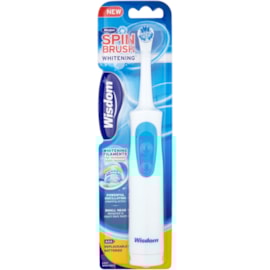 Wisdom Spinbrush Whitening has been specially designed to provide powerful cleaning and stain removal.The whitening filaments help to remove surface stains for whiter teeth, whilst the powerful oscillating cleaning action provides effective plaque removal.Use twice a day for 2 minutes for whiter teeth and a healthy smile!Replaceable batteries:To replace, unscrew the securing screw at the back of the brush to release base cap. Replace with 2 new AAA batteries in the position advised. Re-attach base cap, insert and tighten screw until secure.