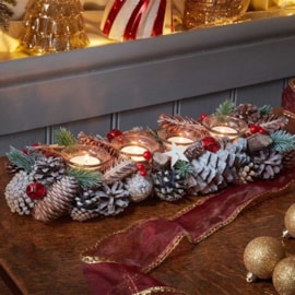 Snowy winter candle holder complete with pine cones, red berries and decorative starsFeatures inbuilt cups perfect for adding LED candles, string lights and moreGreat for decorating dining tables, mantlepieces and windowsillsFor outdoor and indoor use36cm