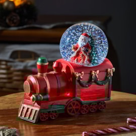 Swirling snow and lights combine to celebrate the magic of Christmas!I Light Up!4 carriages each with a 6 cm water ballBattery operated snow globeFlashing colour changing LED2 x LR44 batteries (included per carriage)For indoor use only13 x 33 x 8 cm