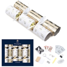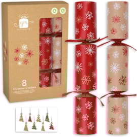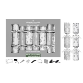 Box of 8Cracker length 4.5"Approximate box measurements 12cm x 12cm x 2cmCracker finish printed design and finished with gold or silver bowsEach cracker contains a snap and mottoTwo assorted colours; gold and silverBox packing board base and acetate lid