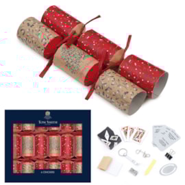Box of 6Cracker length 8.5"Approximate box measurements 25cm x 5cm x 22cmCracker finish red hotstamp base and finished with red curling ribbonEach cracker contains a snap, hat, motto and giftBox packing printed board base and PET 1 lid (lid is stamped with PET logo)