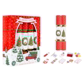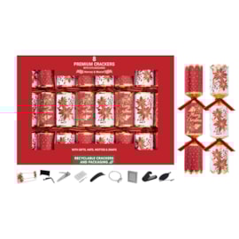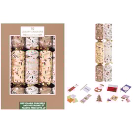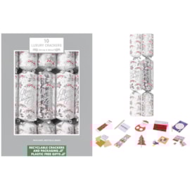 Box of 10Cracker length 12"Approximate box measurements 30.5cm x 24cm x 9cm Cracker finish printed board with red or white base and Santa & Yelpers design and finished with red curling ribbonEach cracker contains a snap, hat, motto and giftRecyclable crackers and packagingPlastic free packaging