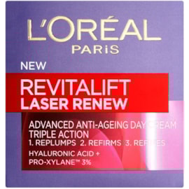 Revitalift Laser Triple Action Anti-Ageing Day Cream, now with a NEW formula, smoothes wrinkles, firms and brightens the look of skin. Formulated with 3 top derm actives, Pro-Retinol, Hyaluronic Acid and Vitamin C*, this formula targets signs of ageing and renews skins appearance. Validated by dermatologists and effective on all skin types. *Vitamin CgRevitalift Laser Triple Action Anti-Ageing Day Cream, now with a NEW formula, smoothes wrinkles, firms and brightens the look of skin.Formulated with 3 top derm actives, Pro-Retinol, Hyaluronic Acid and Vitamin C*, this formula targets signs of ageing and renews skins appearance.PRO-RETINOL Helps to smooth wrinkles and renew skin texture. HYALURONIC ACID Intensely hydrate and re plump the skin.VITAMIN C* Helps to boost skin radiance and visibly correct skin tone unevenness. Validated by dermatologists and effective on all skin types.With Clinically proven results, skin feels:• More toned and firmer• Replumped with moisture.• Skin texture looks more even• Fine lines and crows feet look reduced.*Vitamin Cg