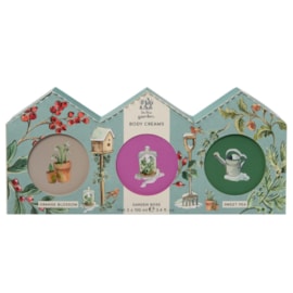 Travel friendly 3 x 30ml hand creams enriched with shea butter and Vitamin E to keep hands feeling soft.Cruelty free and vegan friendly.Formulated with essential oils of lime and tea tree, and extracts of blackberry, rhubarb and elderflower.Fresh fragrance inspired by British gardens with notes of sweet rhubarb and lilac blossoms, green leaves and white roses.Packaging design features hand painted illustrations created by a British artist.
