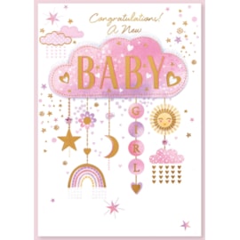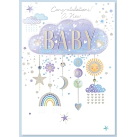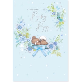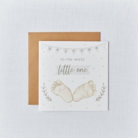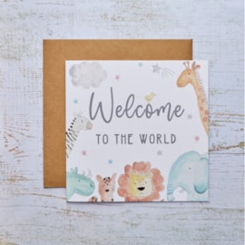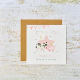 Square white card with illustrations of a sheep, a goose, a bee, flowers, and pastel-colored text reading "With love on your BABY SHOWER you will be a brilliant Mummy x"; includes a brown envelope. Card and envelope are made of paper.